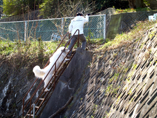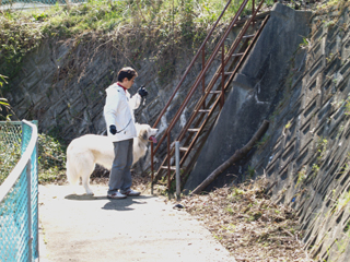 長い階段では、ワンは一気に駆け上がるので、こちらも準備しておかないと、遅れをとるんです。体力つけないとね!