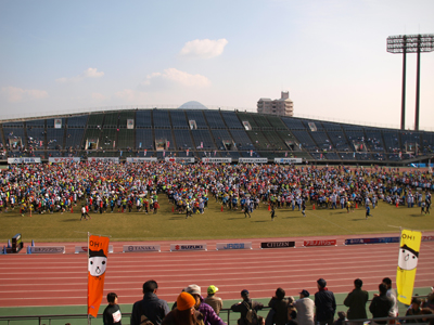 人・人・人・・・・国内のハーフマラソンでは最大の参加人数らしく,約1万人規模です。そりゃー橋が揺れますよ(@_@!!)