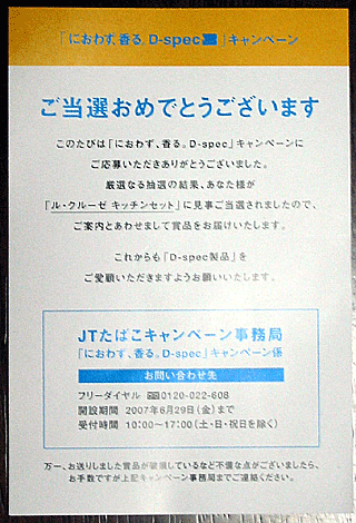 当選!毎年キャンペーンをやっており、昨年は「DVD5.1chシアターセット!」が当たりました。